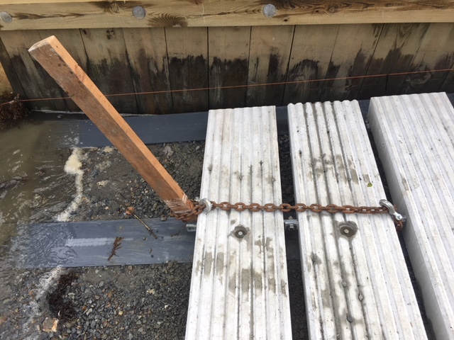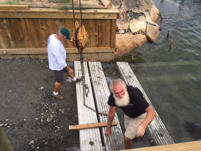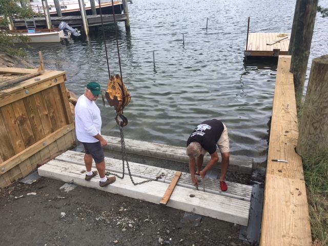 Having secured all the necessary permits, construction has begun on EM Crosby Boatworks’ private ramp for hauling and launching their customers’ boats. The ramp is located just north of the Osterville drawbridge on the Little Island side. It is comprised of (38) 15″ x 12′ x 6″ reinforced concrete slabs. The crew at EM Crosby is building the ramp. There will be a staging area and shop located on the lot behind the ramp.