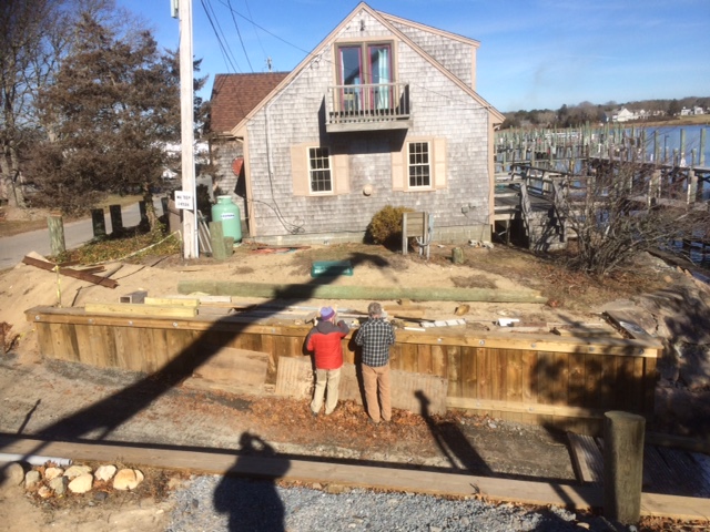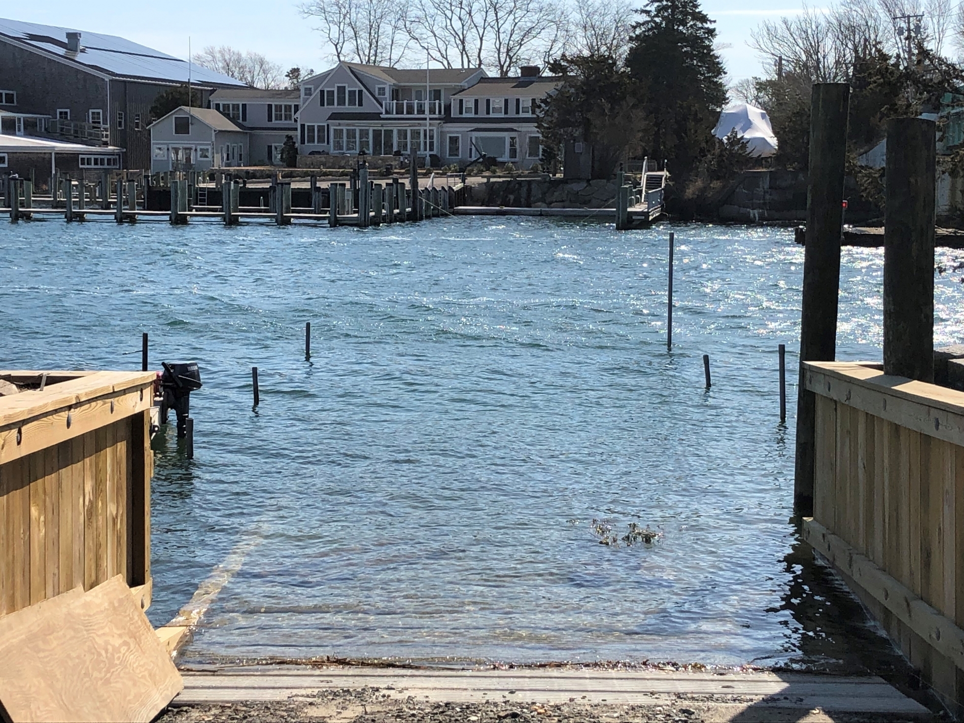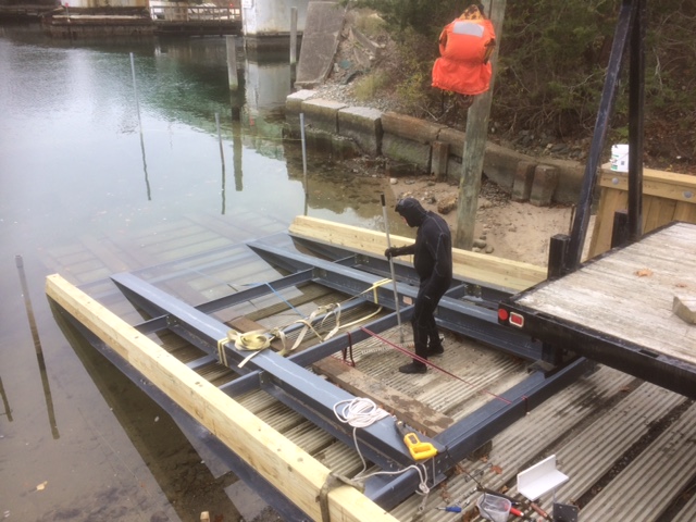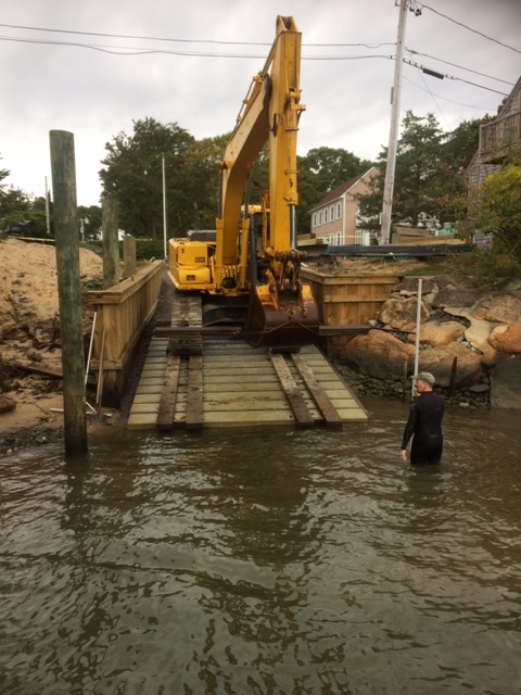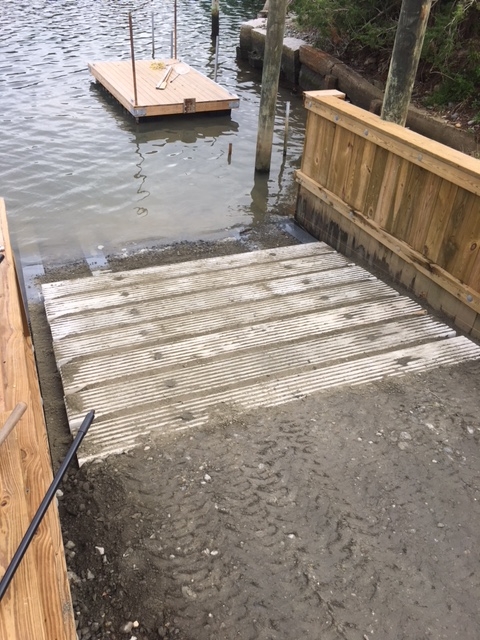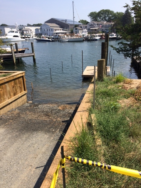 EM Crosby is thrilled to now enjoy the benefits and efficiencies associated with their own ramp and staging area next to the drawbridge in Osterville. The 3 year project, from permit application process to completion, has brought a Crosby boatbuilding and maintenance operation back to the shores of Osterville, where it all began…270 years ago. The ramp is located between Ned and Karen’s father’s workshop, fondly known as the “little shop,” and the old bridge abutment to the south. The bridge abutment conveniently shields the ramp area from the strong current that flows under the bridge. Having historically used the town ramps and the WYC ramp, we often had to “play the tide,” as well as avoid the crowds. We will now be able to haul and launch our customer’s boats on all tides and never again will we worry about being handcuffed by amateur trailer/ramp users!