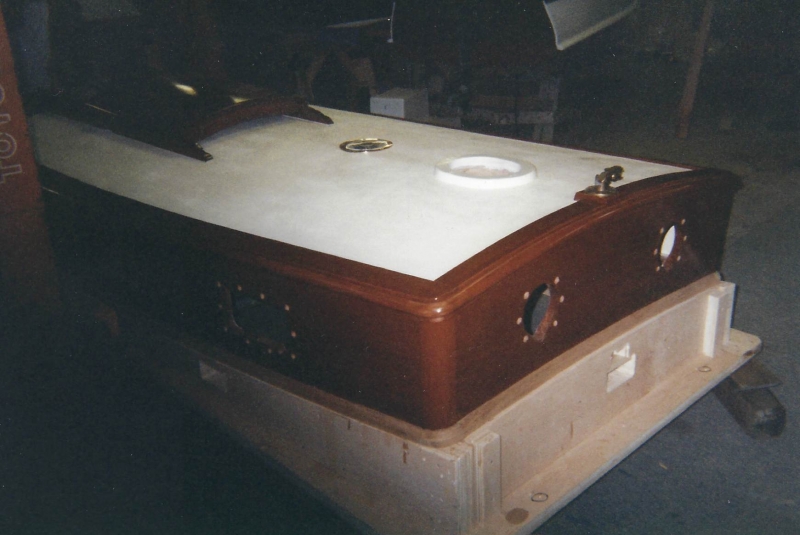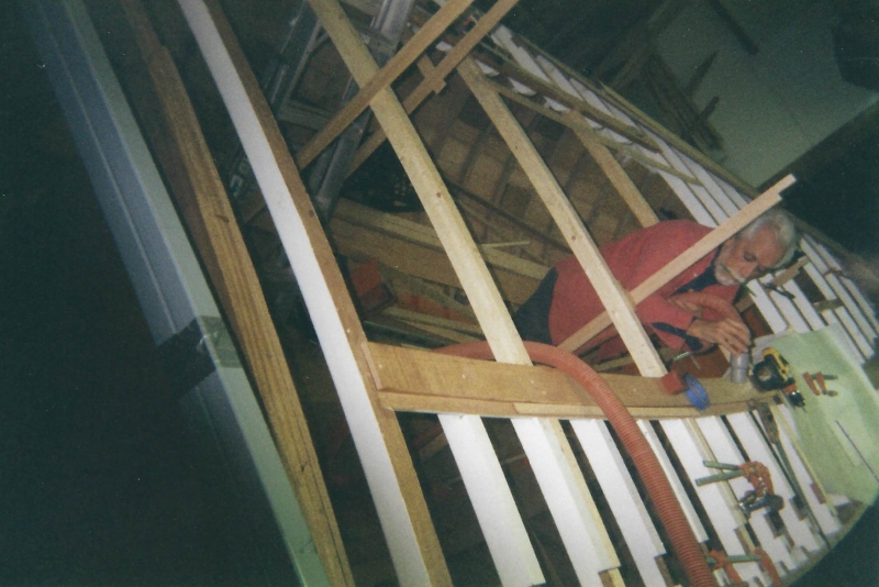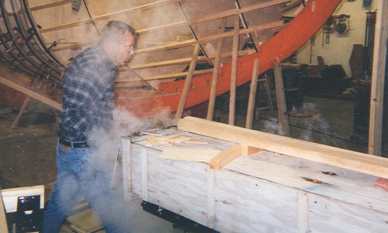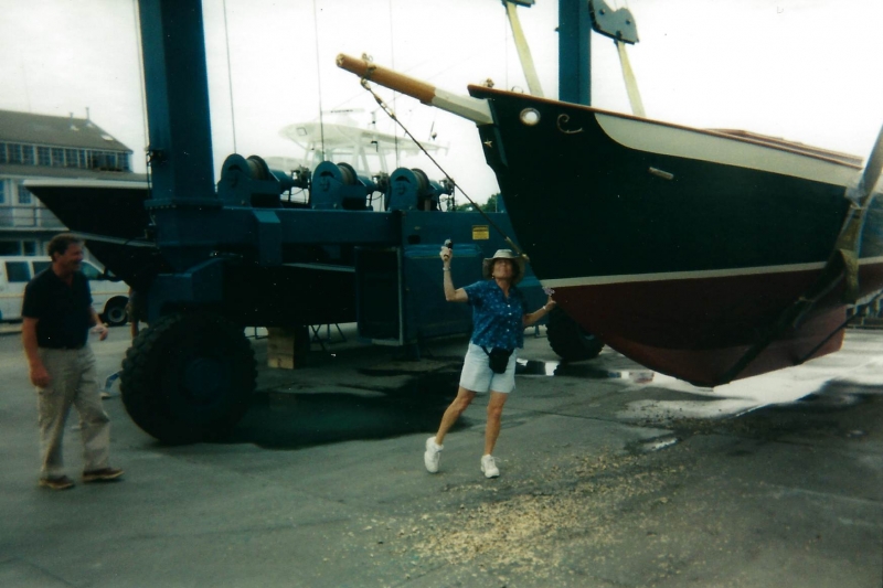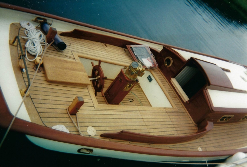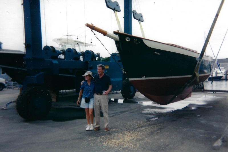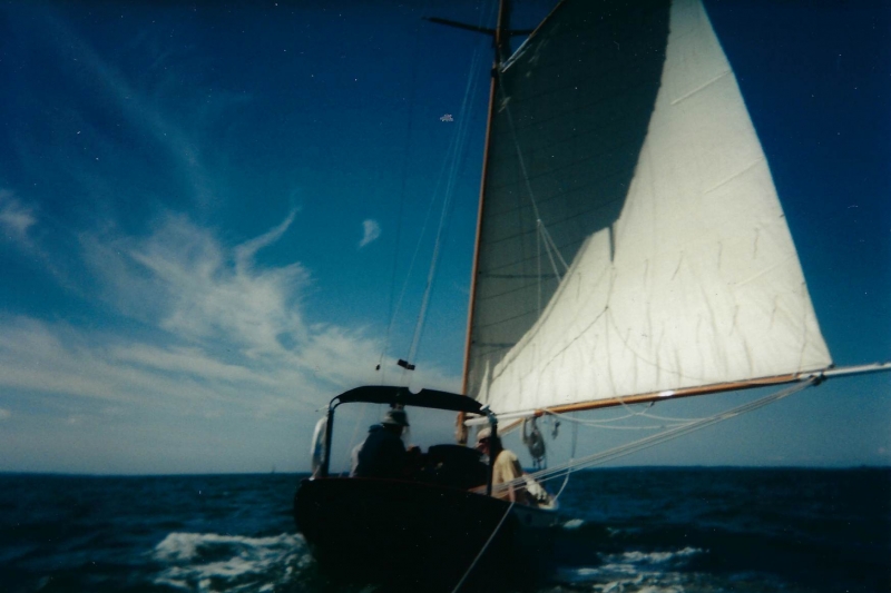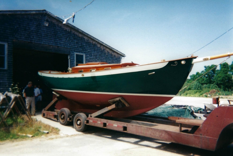 Using plans adapted by naval architect Bill Peterson to accommodate a cutter rig, Ned and the late Teddy Crosby, who had recently “retired” from the Crosby Yacht Yard, built Katy from the ground up: Her keel was one 24-foot-long piece of oak, which the builder, Ned, wet down and bent on the grass behind the shop, then bolted to a 4,400 lb. lead ballast keel. Ned went more high tech with lofting the boat; Edmonds Design used a CNC machine to create and produce the station molds. The owner travelled to Maine to order a 6’ cabin house from a friend who was a woodworker and boatbuilder, and to Vermont for a hollow fir mast from a spar maker. During this time, Crosby’s crew added ribbands, steam bent white oak for frames, and then completed the planking in one month’s time. South African mahogany coamings were added, the hull painted, the caprails varnished and Katy was ready for her launch party. Then the owner accomplished his second dream – to sail Katy to Bermuda before his 70th birthday. Katy now lies at anchor in Cotuit, MA.