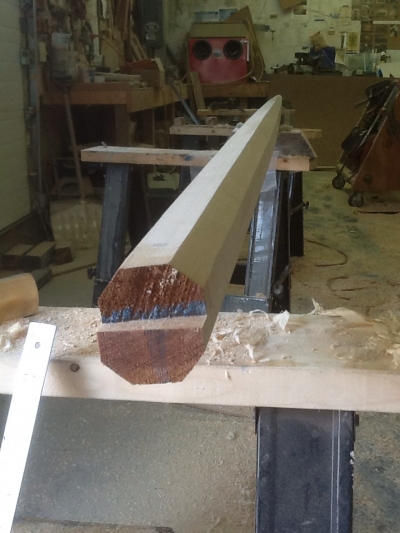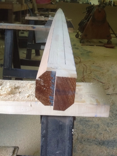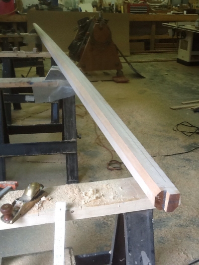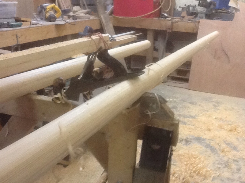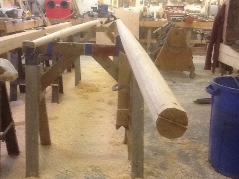 The technique for spar-making is one that has been passed on for generations. The below images illustrate our mast construction. It begins with (3) 2” laminates of “aircraft” grade sitka spruce, 26’ long. A tapered pattern is then marked on the four sides and it begins to take shape on the band saw. The four corners of the blank are then power planed off equally, giving the blank eight sides. The remaining corners are hand planed off, resulting in a near round blank…it is then sanded smooth.