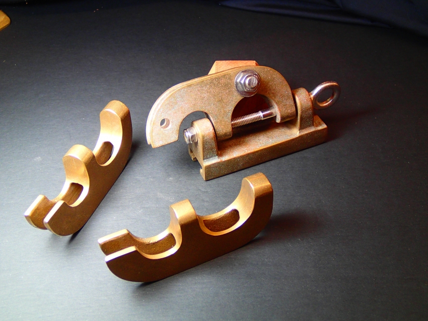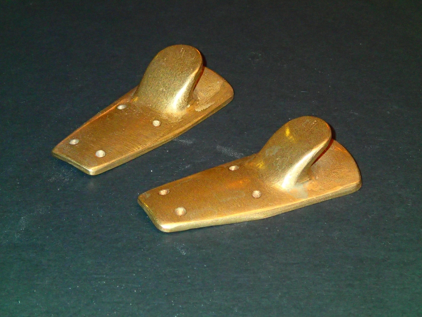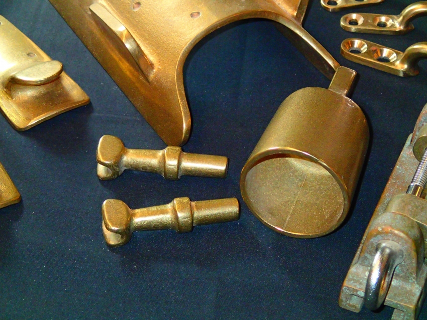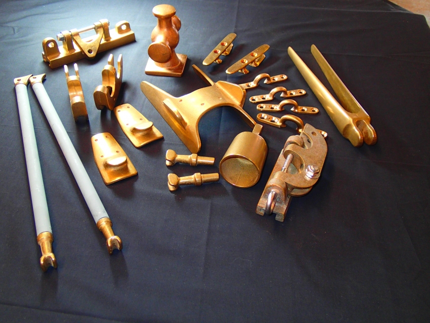 Ned spoke to Edson International about beefing up and improving the hardware and they asked E.M.Crosby boatworks to shape, carve and fashion wooden replicas of what they were looking for. Replicas of all the Senior’s custom hardware were produced and Edson went to work creating the new components. Pictured are the results of the time-consuming and costly efforts…the new bronze hardware is beautifully strong and functional.